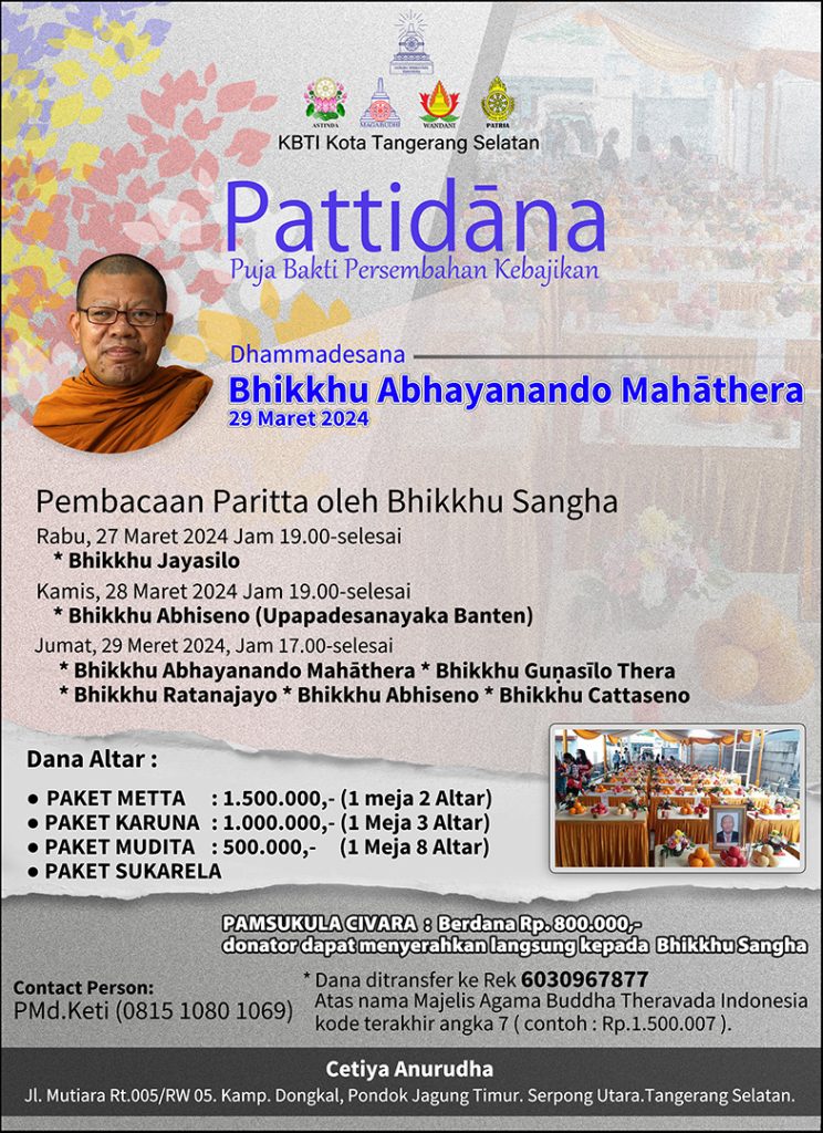 - Kamis, 28/03, Jam 19.00-selesai oleh YM Bhante Abhiseno (Upapadesanayaka Banten)